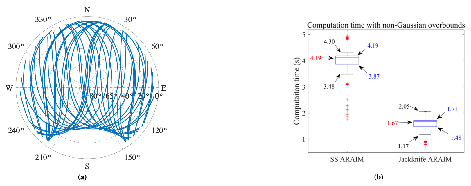 Computation time comparison for GPS-only constellation: (a) Trajectories of GPS satellites over a 24-hour period; (b) The box plot of computation times for jackknife and SS ARAIM methods both with non-Gaussian overbounds.