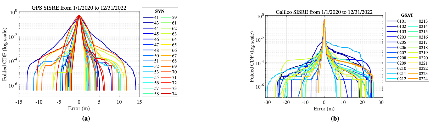 The folded CDF of (a) GPS and (b) Galileo SISRE for individual satellites from January 1st, 2020 to December 31st, 2022. A significant non-Gaussian pattern is observed.