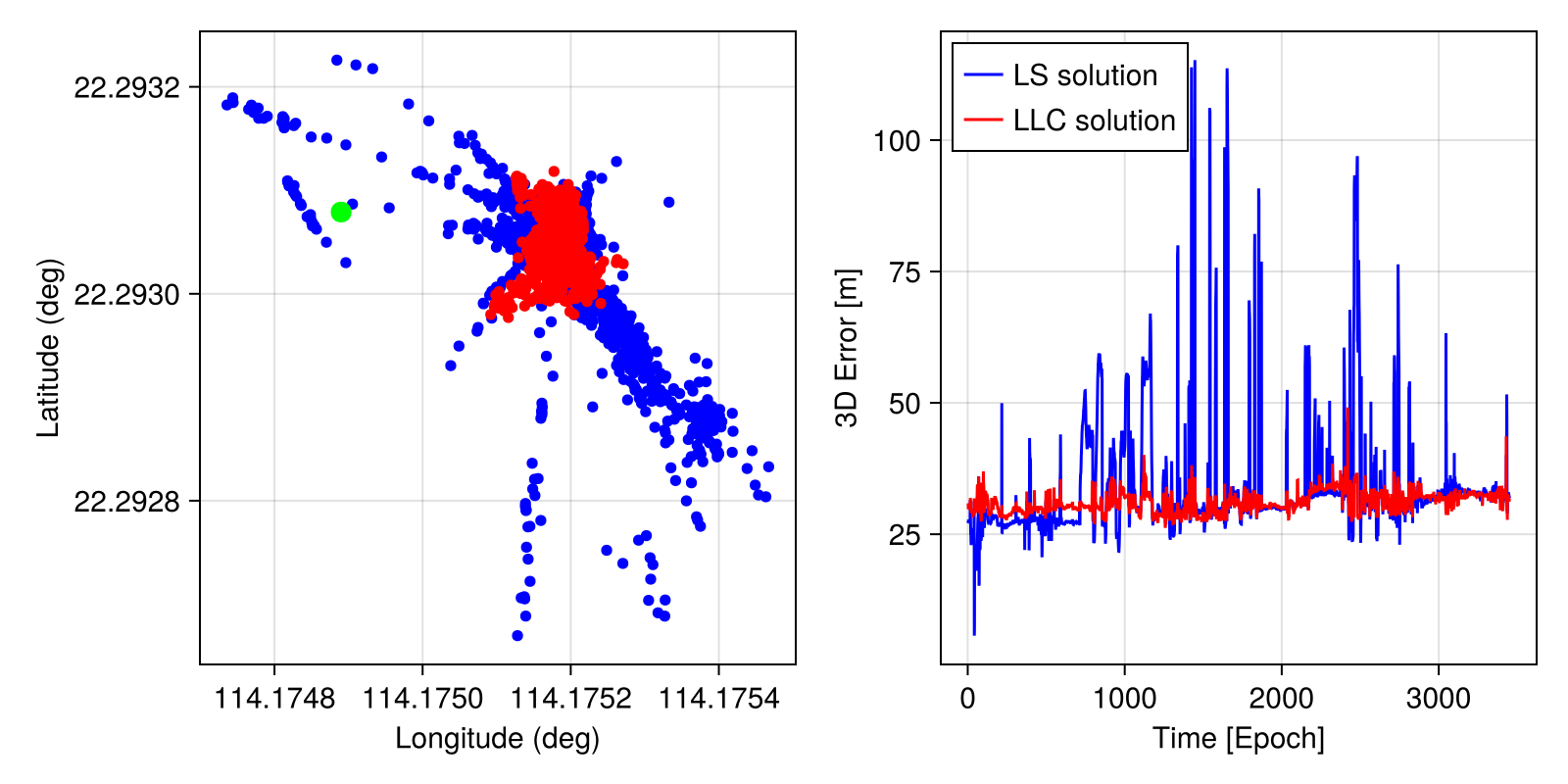 Positioning results of LQLC vs. LS on real urban GNSS data in Hong Kong.